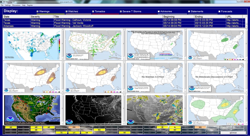 WXWarn will also display up to 12, real time weather graphics that you can configure for content and size! This software is designed to download and parse weather data published by the NWS.